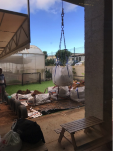 Con grandes ojos, los niños se maravillaron mirando por la ventana, observando cómo se recogía la arena mediante un laborioso trabajo y luego se la llevaban. Al día siguiente, pudieron observar cómo se traía la arena nueva con una grúa que elevaba los sacos por encima del techo de la Escuela Infantil. La alegría y las ganas de jugar en el arenero crecían con cada saco de arena.