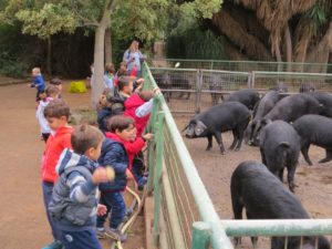 Cuando llegamos a la granja, su propietario nos dio una cálida bienvenida. Después de un breve saludo, nos dirigimos directamente hacia las cuadras de los animales. En primer lugar, los niños conocieron al cochino negro, típico de Canarias. Habíamos preparado muchas frutas y verduras para alimentar a los animales. Tras ver los cerdos, pasamos a observar a las ovejas y cabras. En el fin de semana anterior las últimas habían tenido crías y se les permitió a los niños que cogieran y acunaran a los cabritillos de apenas unos días de edad. Después, los niños fueron guiados desde el gallinero hasta los conejos y gansos, pasando alrededor de un estanque con ranas. Finalmente, fuimos a ver las incubadoras de los pollos. Allí los niños pudieron conocer a los pollitos de la granja.