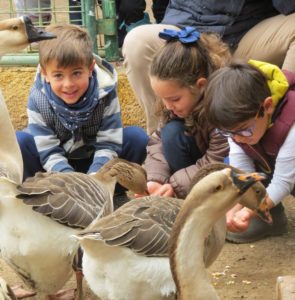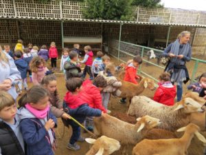 Cuando llegamos a la granja, su propietario nos dio una cálida bienvenida. Después de un breve saludo, nos dirigimos directamente hacia las cuadras de los animales. En primer lugar, los niños conocieron al cochino negro, típico de Canarias. Habíamos preparado muchas frutas y verduras para alimentar a los animales. Tras ver los cerdos, pasamos a observar a las ovejas y cabras. En el fin de semana anterior las últimas habían tenido crías y se les permitió a los niños que cogieran y acunaran a los cabritillos de apenas unos días de edad. Después, los niños fueron guiados desde el gallinero hasta los conejos y gansos, pasando alrededor de un estanque con ranas. Finalmente, fuimos a ver las incubadoras de los pollos. Allí los niños pudieron conocer a los pollitos de la granja.