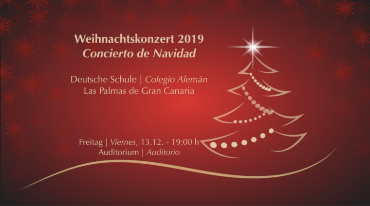 Les invitamos cordialmente a nuestro Concierto de Navidad el viernes 13/12/2019 a las 19:00 horas en el auditorio del Colegio Alemán de Las Palmas. A continuación se celebrará el tradicional Mercadillo de Navidad.
