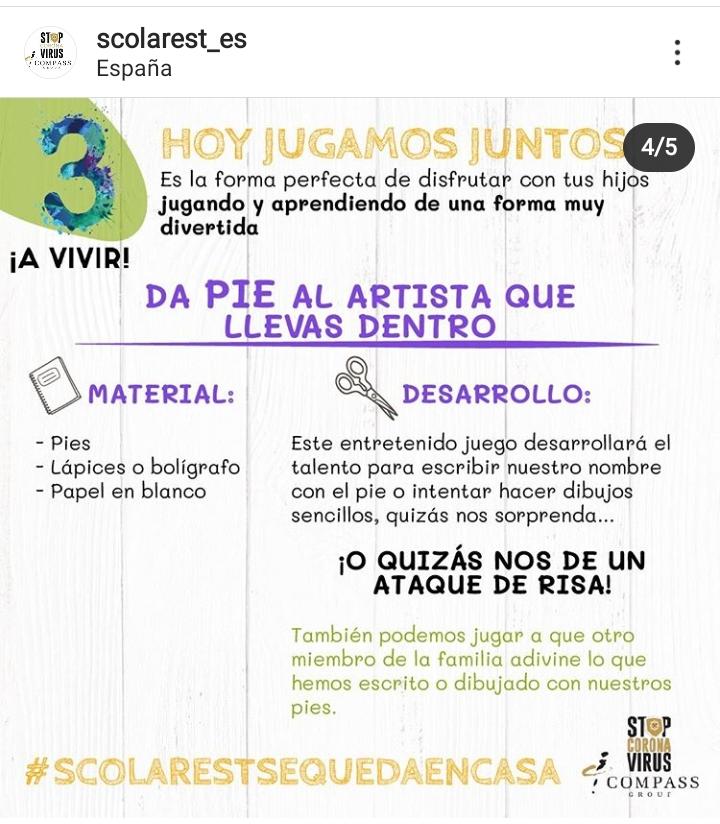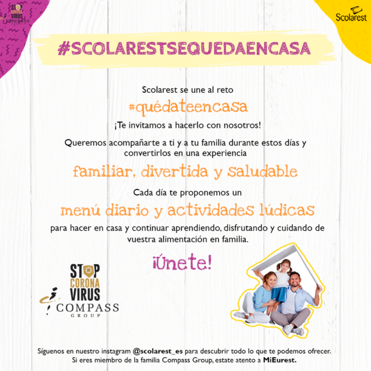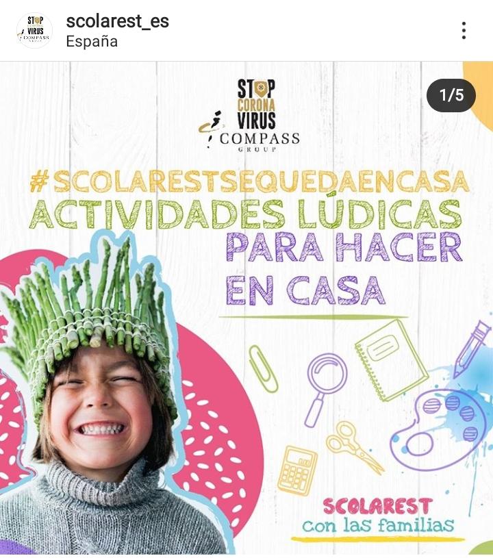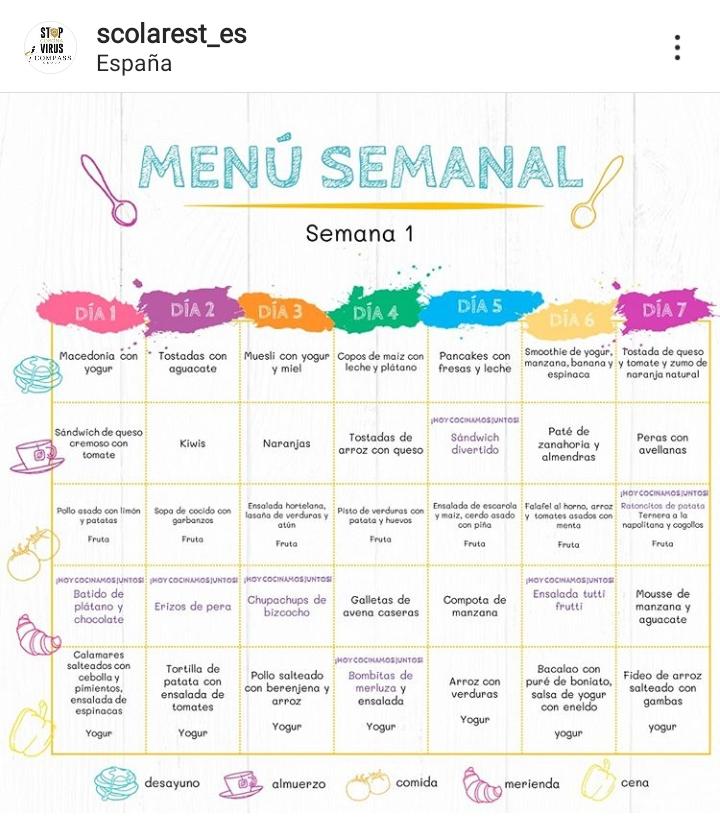 Si bien ahora no están cocinando para nuestros alumnos en el cole sí les propone, a través de los medios digitales, seguir manteniendo un menú equilibrado y realizar actividades divertidas. Pueden disfrutar de esta propuesta a través de Instagram: @scolarest_es