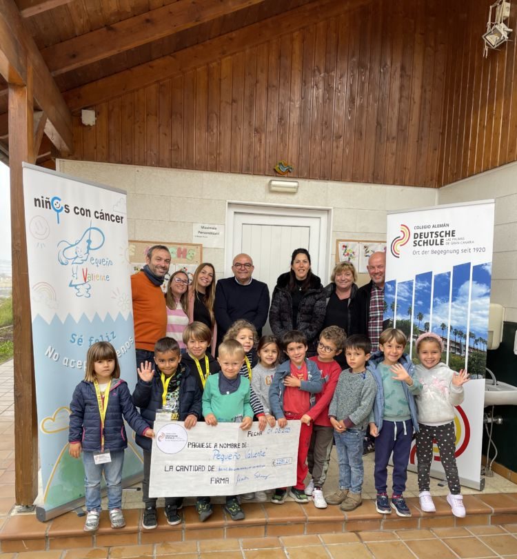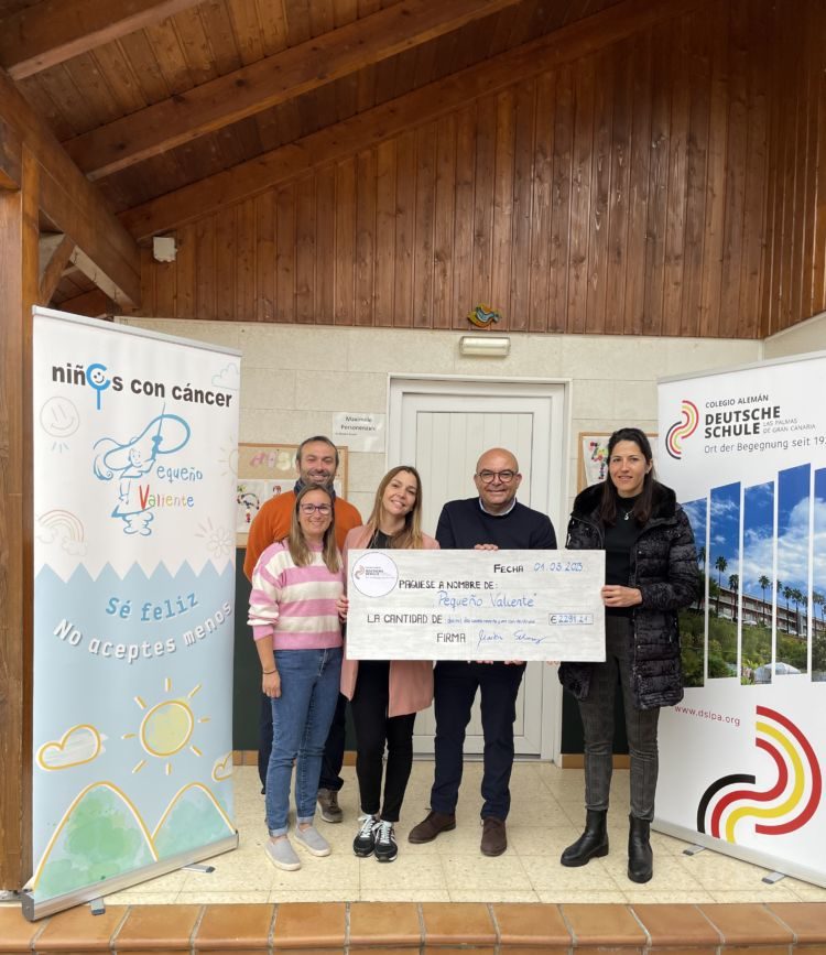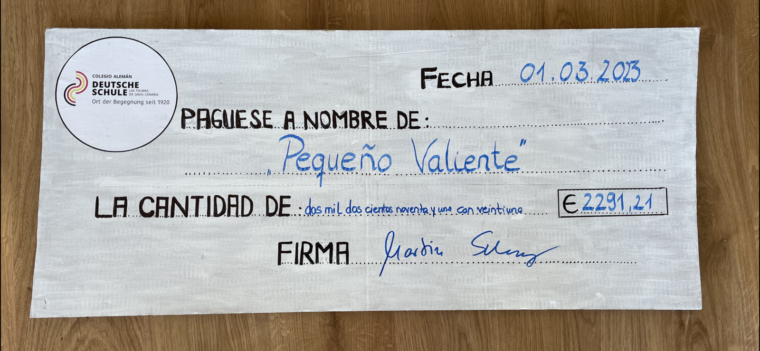 El 1.03.2023, el consejo Infantil, los representantes de los padres, la directora de Infantil, Annette Peters, y el director, Martin Schweinsberg, hicieron la entrega oficial. En total, el presidente de «Pequeño Valiente» José Juan Jerez Castro recibió un cheque del: 2.291,21euros para esta obra social en sus casas. Estamos seguros de que nuestra donación será una buena contribución para apoyar a los niños en sus a veces difíciles situaciones.